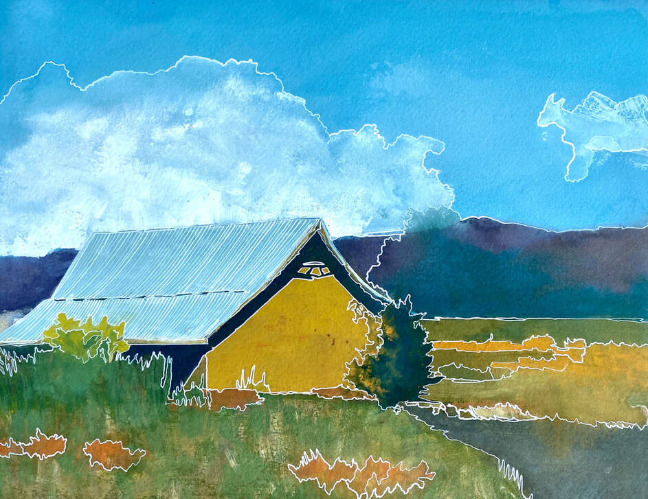 NIELSEN BARN by Amalia Fisch - Watercolor, gouache, acrylic ink on paper, 14"W x 11"H, $500