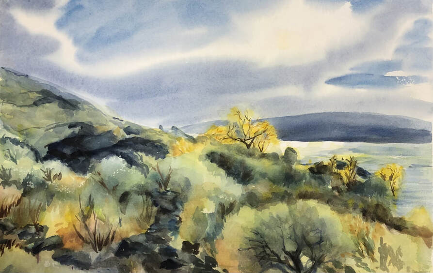 SAGEBRUSH ALONG THE COLUMBIA GORGE by Sara Cate - Watercolor on paper, 21.5"W x 13"H