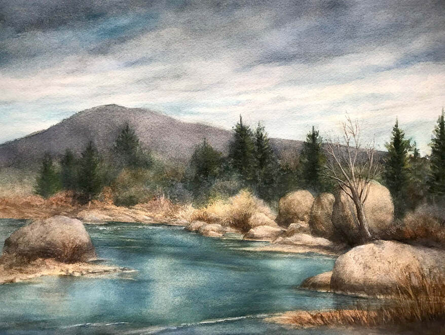 FIRST SNOW IN THE YAKIMA CANYON by Sara Cate - Watercolor on paper, 21.5"W x 14.75"H, $1200