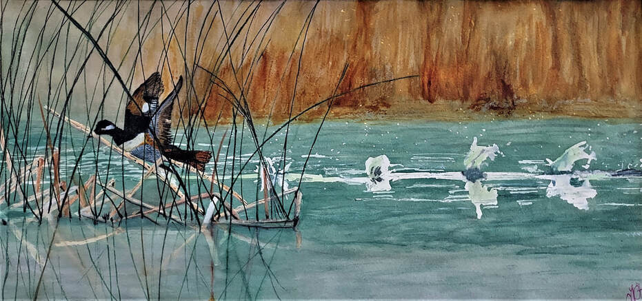 TAKE OFF by Nancy Huck - Watercolor, 20.75"W x 9.25"H, $400