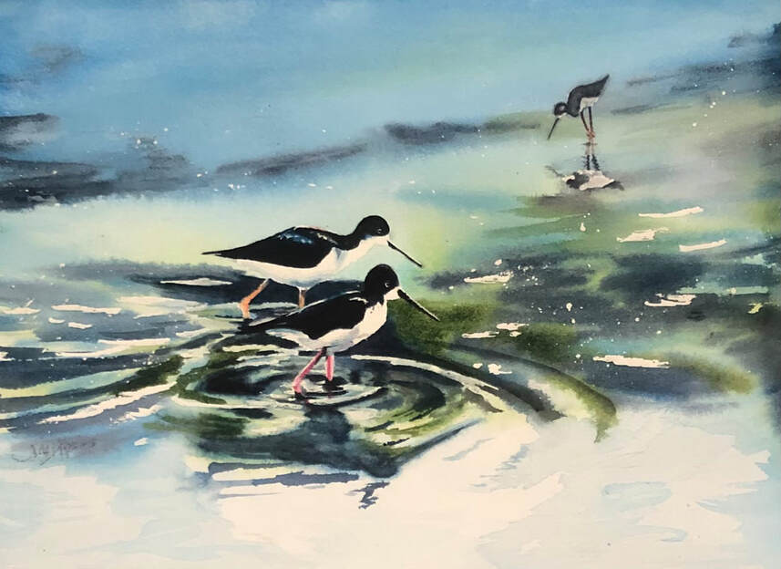 HAWAIIAN STILTS (Ae'O) by Julie Hopkins - Watercolor on paper, 15"W x 11"H