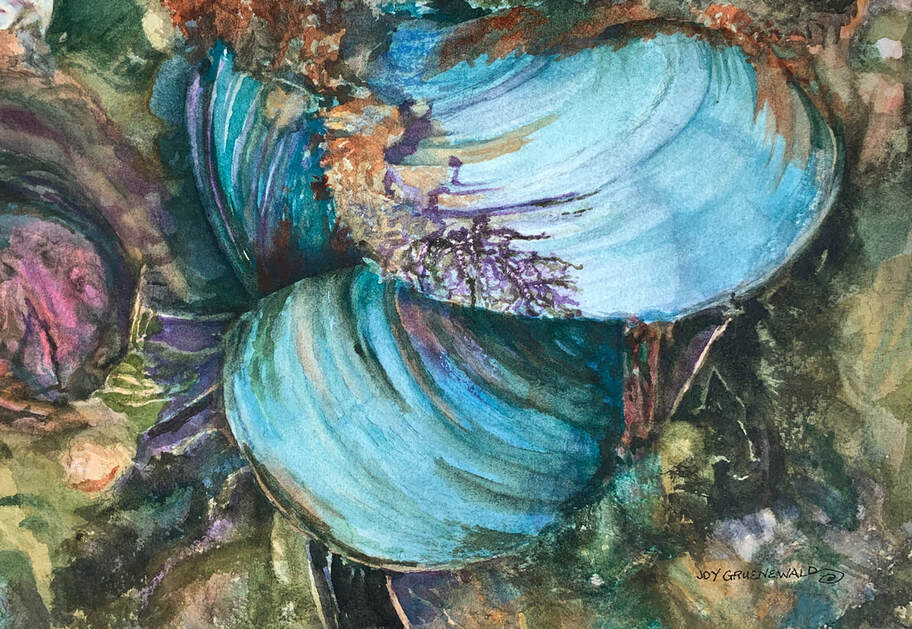 CLAMS, BARNACLES, AND OTHER STUFF by Joyce Gruenewald, Watercolor on paper, 13.75"W x 9.75"H