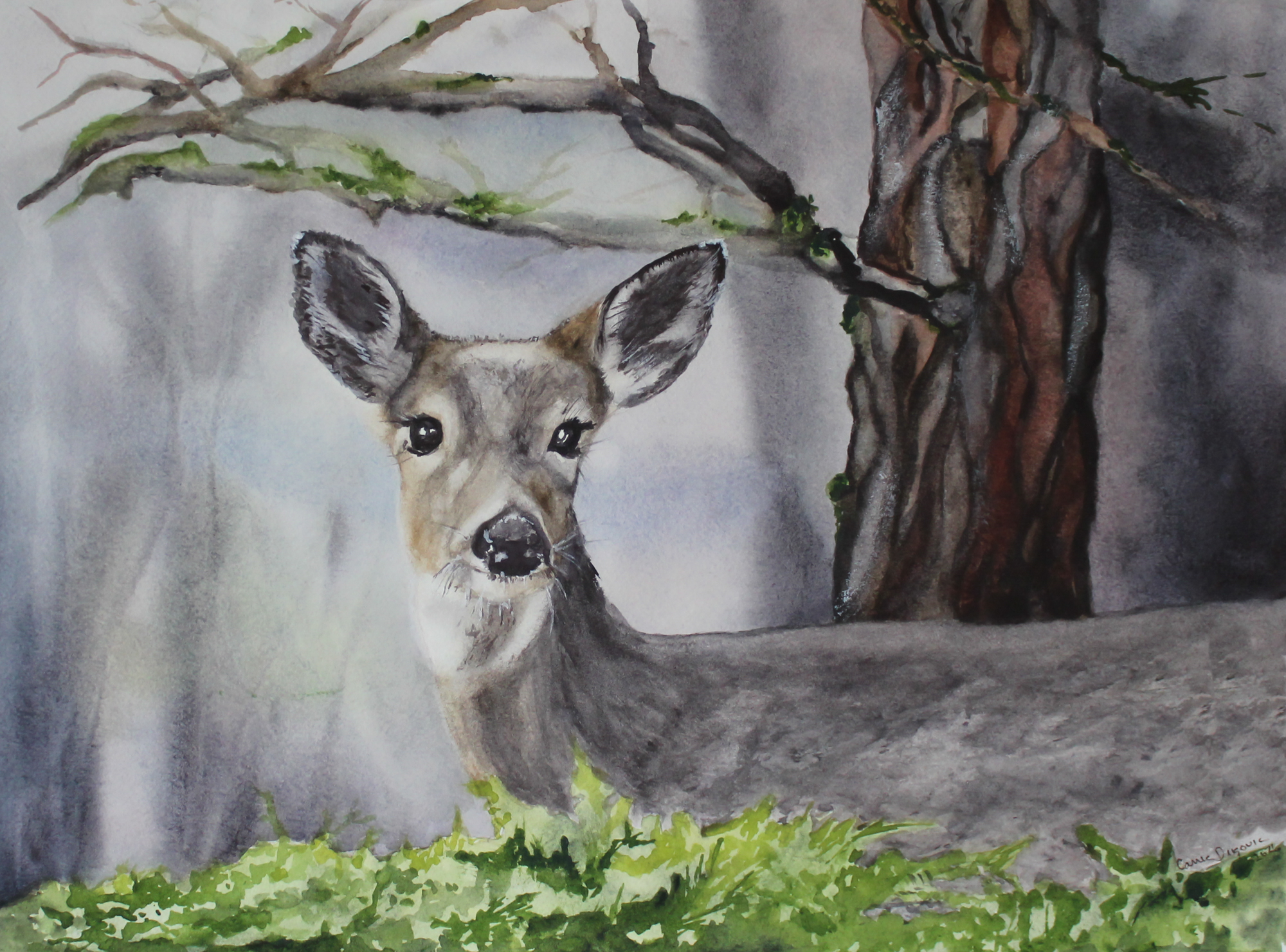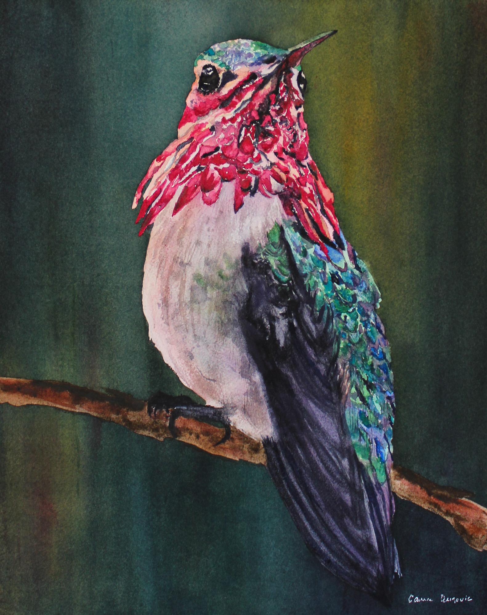 I find painting with watercolor mesmerizing. Starting with a blank piece of paper, anticipation builds as the translucent layers emerge. The luscious mix of colors combine to create on paper the images that nature presents, infinitely changing moment by moment, invoking our emotional response and wonder. Patience is both difficult and welcome to slow down and observe as the layers dry. My favorite subjects to paint are ones with expressive eyes. To capture the essence of a living creature brings me great joy.