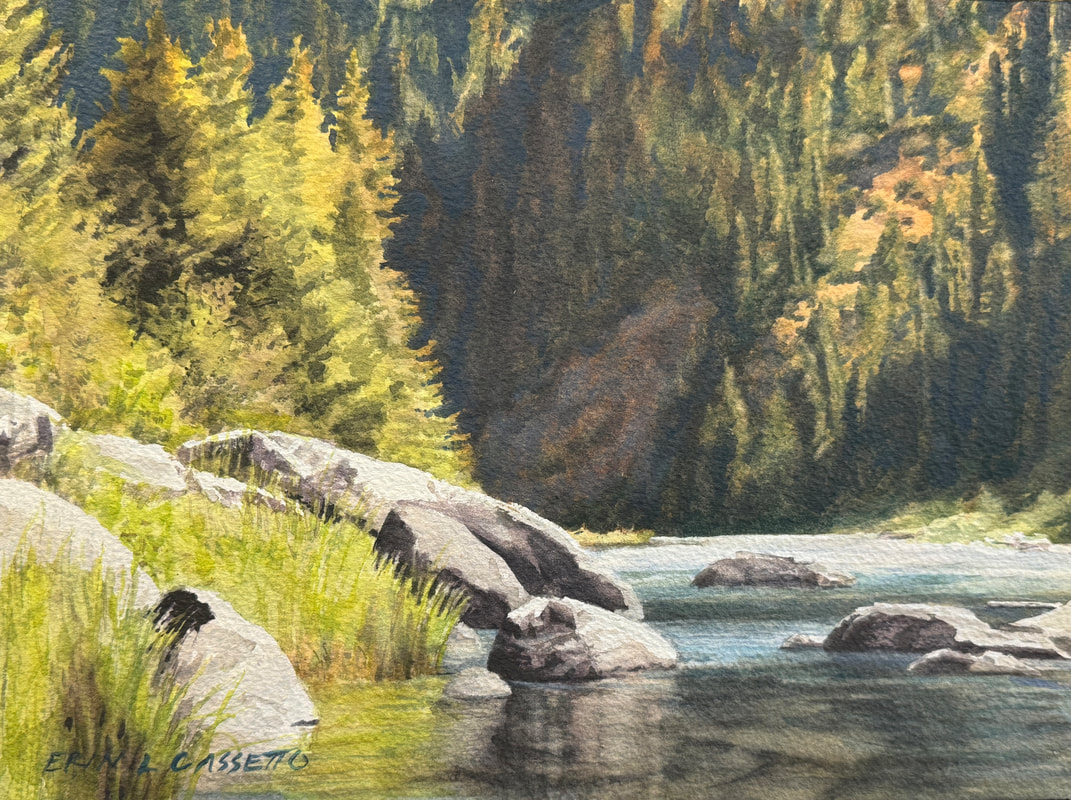Erin earned a Bachelor of Arts in Art and Art History from Drury University and went on to earn her Master of Fine Arts from Washington State University (WSU). Her work has been recognized in juried shows, publications, and plein air competitions. Erin loves hiking and fly fishing throughout the Inland Northwest. She'll often carry both her fishing equipment and painting supplies with her into remote areas. On days when the fishing is slow, having a paintbrush handy is so rewarding. On days when the fishing is red-hot, she'll remember the scenes and celebrate the day in her studio.