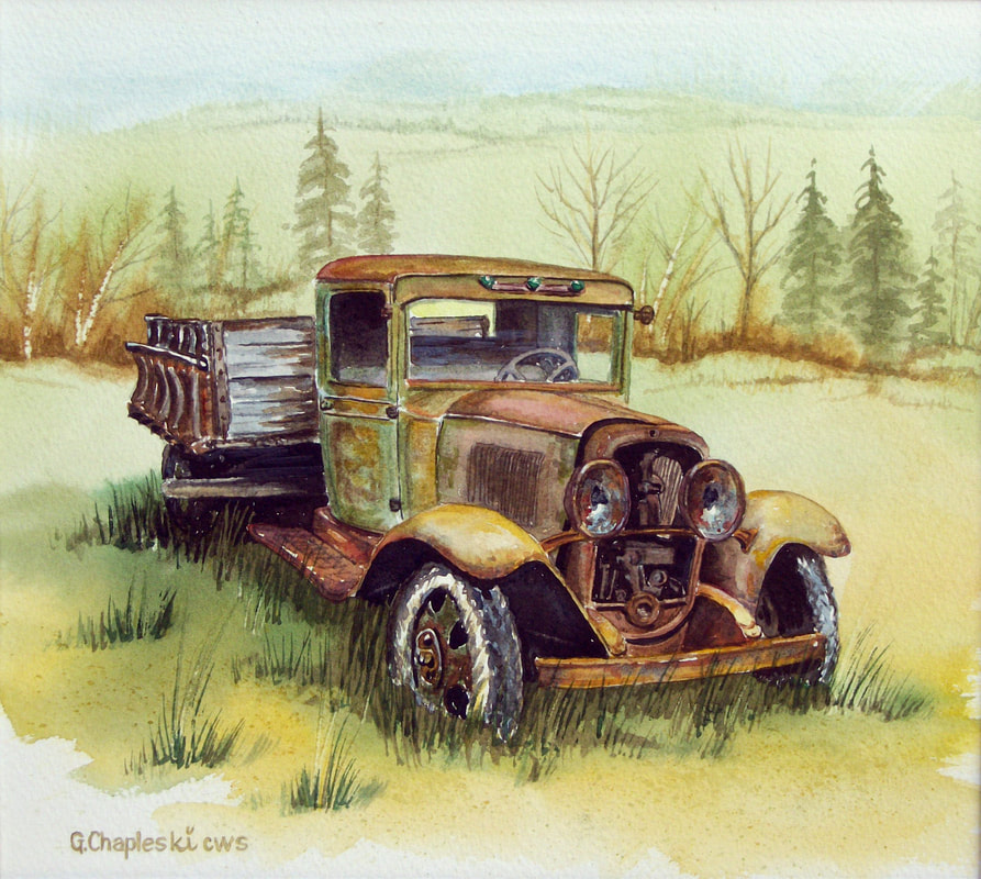 He often drives his pickup on back-roads, with a camera in hand to photograph reference material of old structures, steam engines, rusty pickups, or anything with scenic or nostalgic value… click, click!